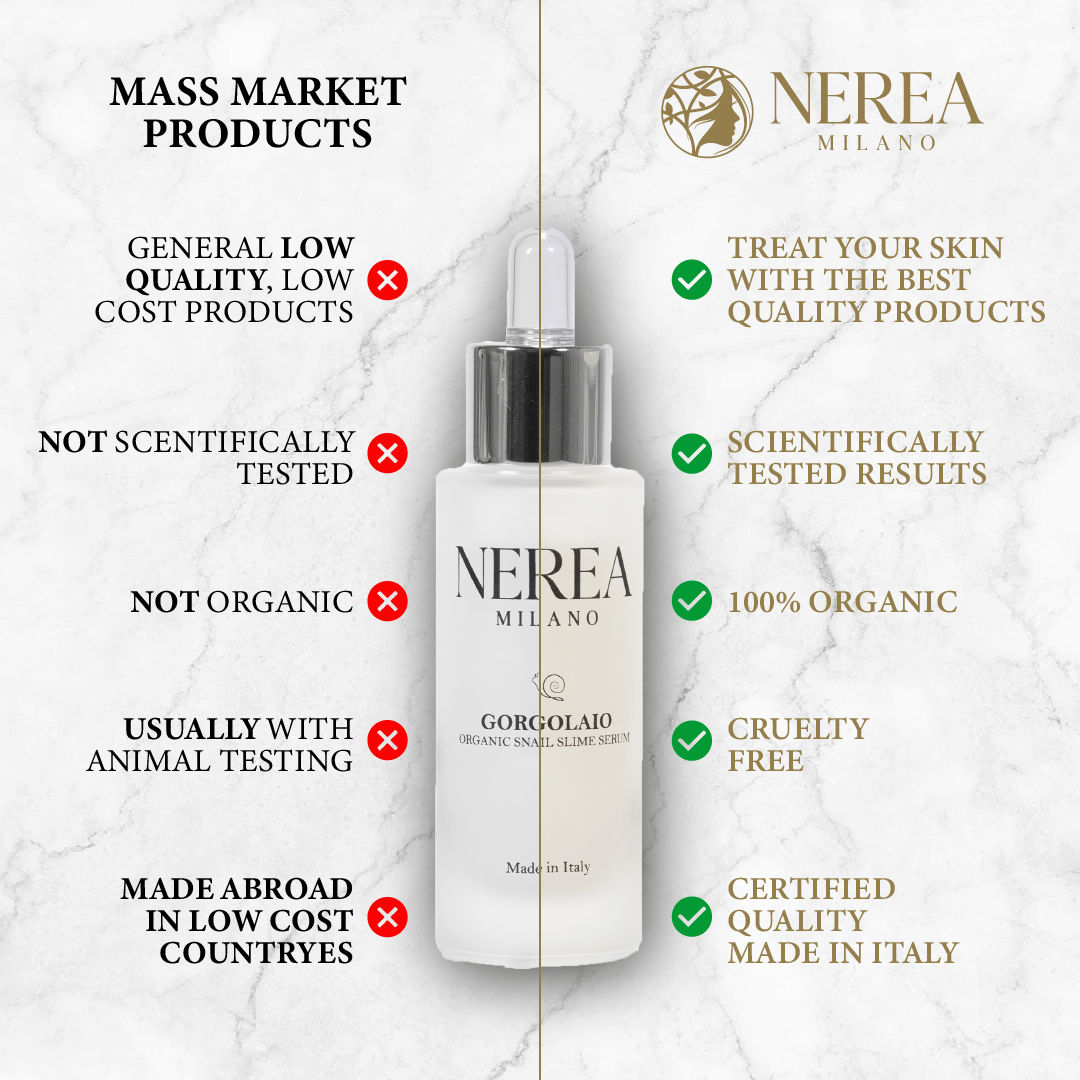 Amplified natural anti-aging benefits, thanks to the Enhanced Snail Slime formula by NEREA, with additional Hyaluronic Acid, Vitamins, Collagen and several ORGANIC plants extracts.